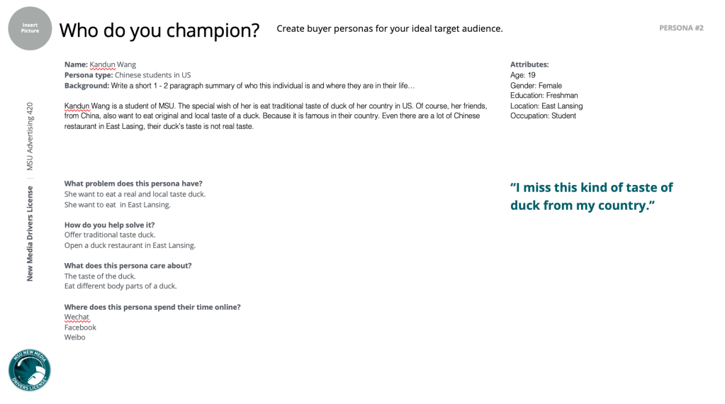 Our customer base is divided into two categories. One is overseas Chinese. It is difficult for them to eat authentic Chinese-style duck in the United States. Although there are many Chinese restaurants in the United States, not every restaurant makes the Chinese-style duck so authentic. Chinese-style duck is a very common snack in China. Basically, every Chinese loves Chinese-style ducks, especially duck parts such as duck neck and duck tongue. For these customers, what we want to offer is the real Chinese-style duck. The image below shows an example of a student named Kandun Wang.