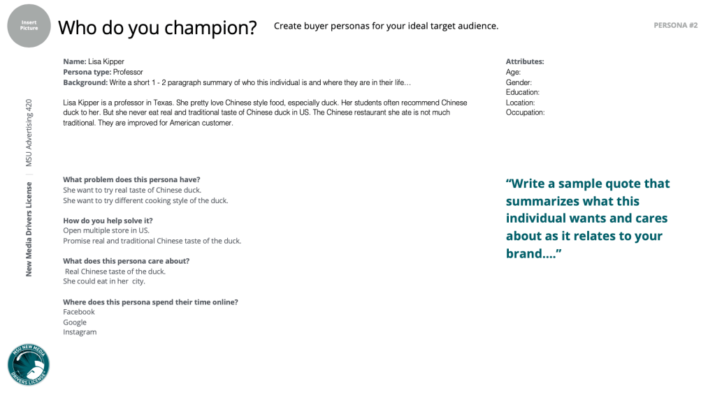 The voice of my brand is real and traditional. We want our attitude to be specializing ourselves in making real Chinese style duck. We want our chefs to be committed to their works, focusing on doing traditional Chinese taste. We are dedicated to creating an enjoyable experience for our customers in terms of eating Chiese style duck. Other than that, I want my brand’s voice to be enthusiastic and infectious as well. Let more and more people love Chinese style duck.