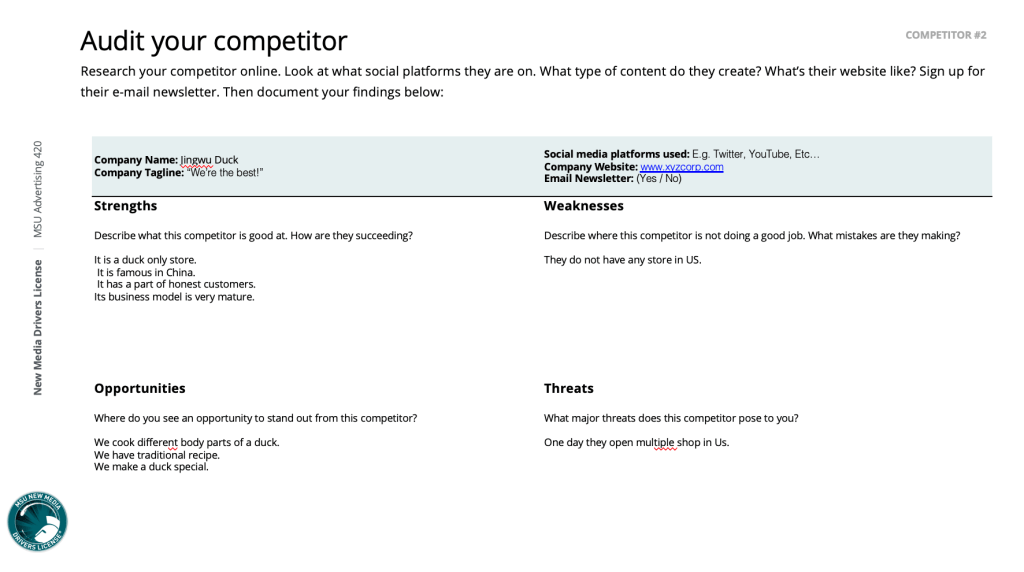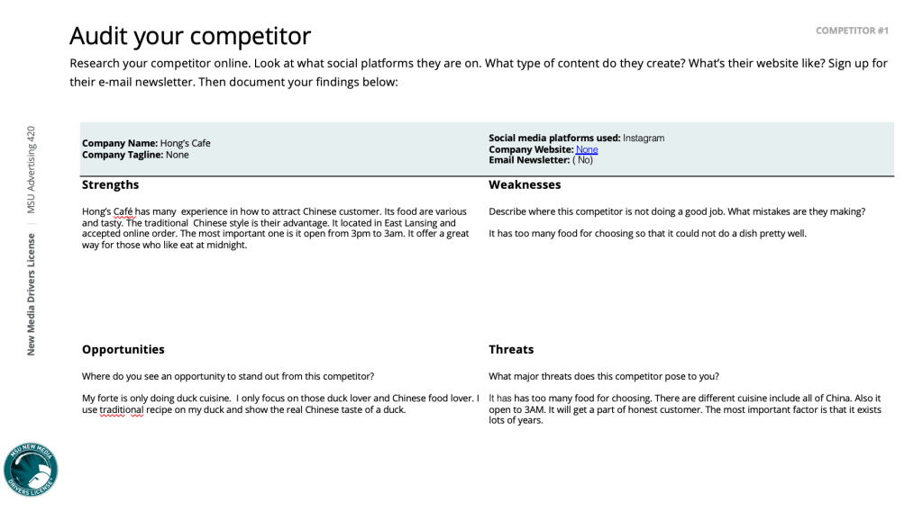 A business needs to grow from competition. For our company, there are two representative competitors. One is Hong’s Cafe. This is a Chinese restaurant that has been in East Lansing for a long time. They have a large group of loyal fans. They have many dishes. They acquire customers by opening hours and different types of cuisine.